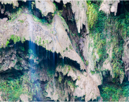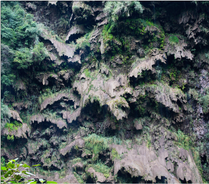 钙华的形成同时包含物理化学作用与生物作用,一方面,地表水与地下水含大量碳酸钙,水流从高处跌入峡谷时,经空中抖动和岩壁冲击,促使二氧化碳大量逸出,使碳酸钙溶液达到过饱和状态并在岩壁沉积形成钙华;另一方面,崖壁藻类、苔藓等低等植物通过光合作用消耗二氧化碳,进一步加速钙华沉积,最终形成如今的独特景观。